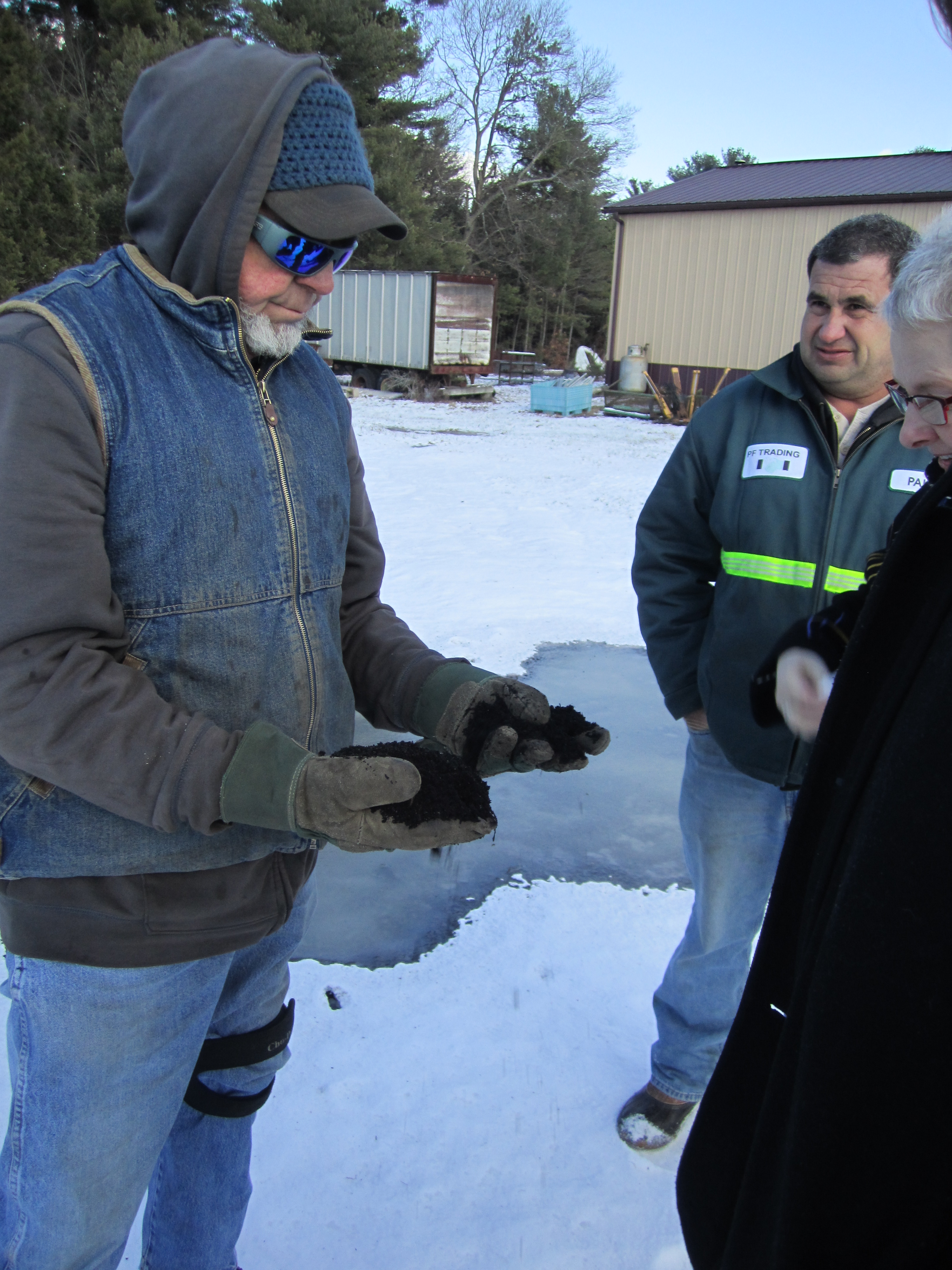 Earl Newland of Newland Farm shows UUA’s Jan Sneegas and Paul Frade of PF Trading what happens when clean yard trimmings are combined with nutrient rich food waste from events: happy, healthy soil!