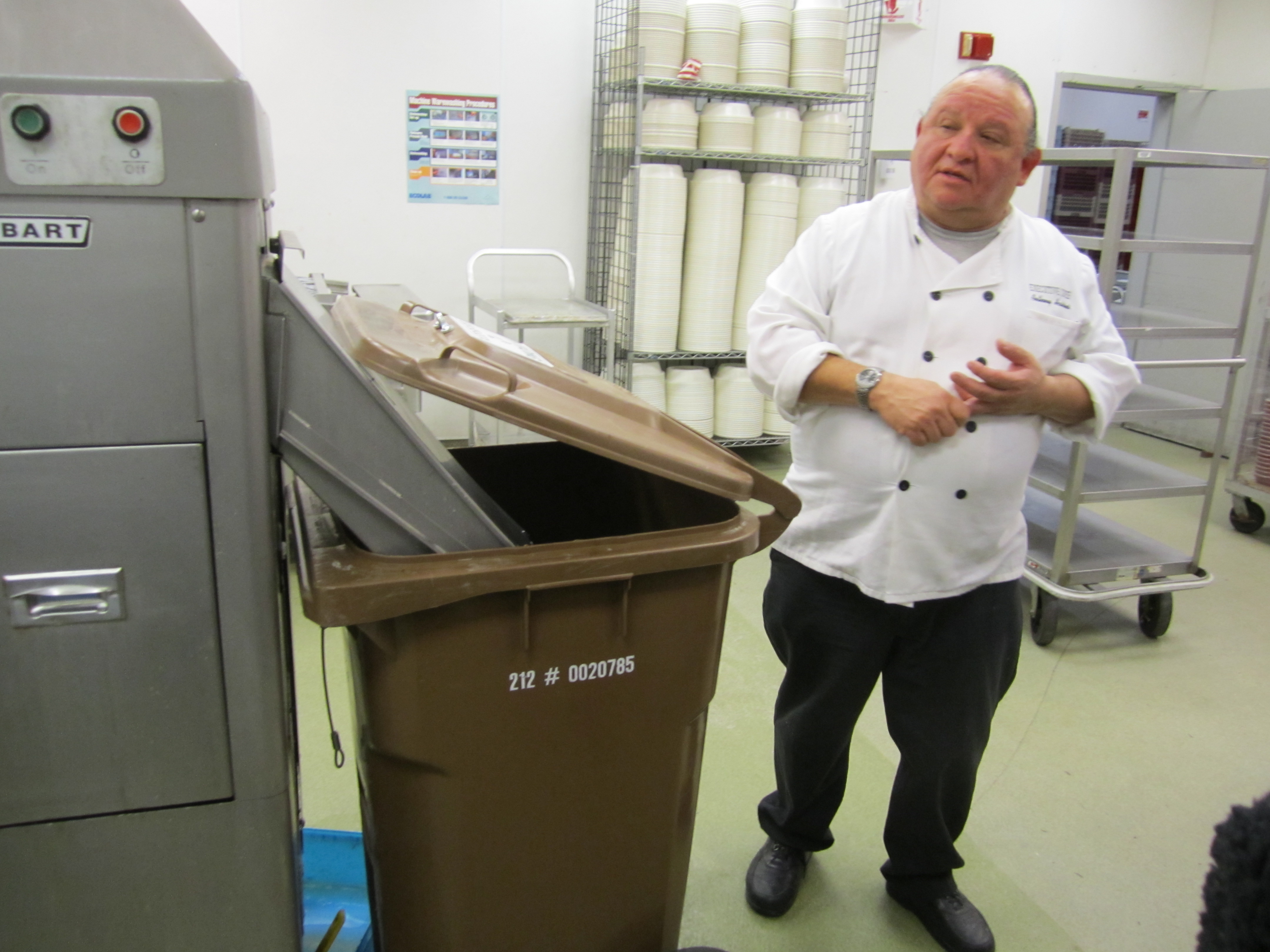Chef Anthony Haskins demonstrates how a kitchen pulper prepares food waste for composting at the Rhode Island Convention Center